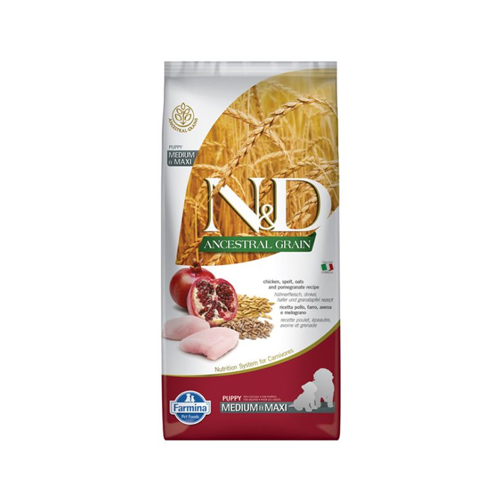 Πλήρης τροφή με κοτόπουλο, ρόδι και προγονικά δημητριακά, για το ανήλικο μεσαίου ή μεγάλου μεγέθους σκύλο σας καθώς και για έγκυες ή θηλάζουσες σκυλίτσες. Τα προγονικά δημητριακά όπως η όλυρα και η βρώμη έχουν χαμηλό γλυκαιμικό δείκτη κι αυτό επιτρέπει τη σταδιακή απελευθέρωση ενέργειας καθ’ όλη τη διάρκεια της ημέρας, προωθώντας μια καλύτερη αντίδραση στην ινσουλίνη και λιγότερο στρες στο πάγκρεας. Η τροφή περιέχει επίσης χονδροϊτίνη και γλυκοζαμίνη που βοηθούν στην υγεία των αρθρώσεων καθώς και φρουκτοολιγοσακχαρίτες που βοηθούν στην ανάπτυξη των καλών βακτηριδίων του εντέρου. Πλούσια σε υψηλής ποιότητας πρώτες ύλες συμπεριλαμβανομένων πολύτιμων βιταμινών, που έχουν μεγαλύτερη αποτελεσματικότητα χάρη στην τεχνολογία ψυχρής έγχυσης. Η τροφή συσκευάζεται σε προστατευτική ατμόσφαιρα με τη χρήση αζώτου αντί για οξυγόνο και έτσι τα θρεπτικά συστατικά της διατηρούνται αναλλοίωτα με την πάροδο του χρόνου. Πρόκειται για μια γευστική τροφή, υψηλής βιολογικής αξίας, η οποία είναι πλούσια σε θρεπτικά συστατικά που ανταποκρίνονται στις ειδικές ανάγκες του σκυλάκου σας.