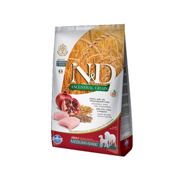 Η N&D Αncestral Grain είναι μία σειρά τροφών με λίγα προγονικά δημητριακά (όλυρα και βρώμη), επιστημονικά σχεδιασμένη για να καλύψει τη σαρκοφάγα φύση των σκύλων. Μόνο με φυσικά αντιοξειδωτικά, πλούσια σε τοκοφερόλη, η οποία παρέχει φυσική συντήρηση στην τροφή. Επίσης πλούσια σε μακράς διάρκειας πρώτες ύλες (συμπεριλαμβανομένων πολύτιμων βιταμινών) που προστίθενται με την τεχνολογία “ψυχρής έγχυσης”.