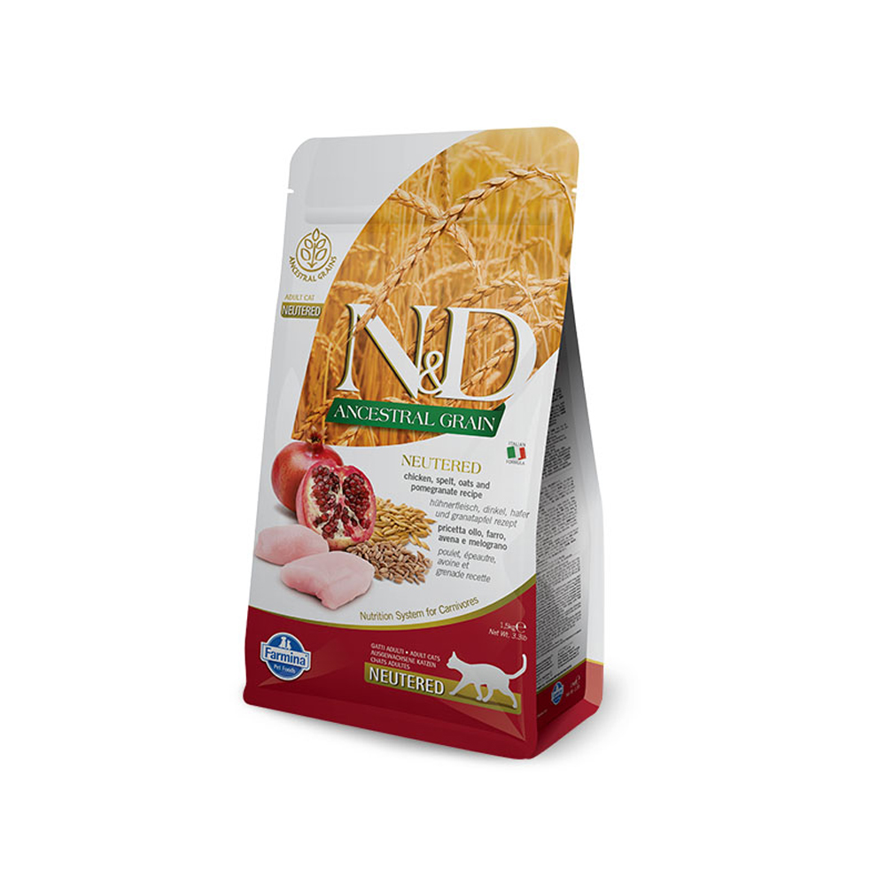 H N&D Αncestral Grain είναι μία σειρά τροφών με λίγα προγονικά δημητριακά (όλυρα και βρώμη), επιστημονικά σχεδιασμένη για να καλύψει τη σαρκοφάγα φύση των γατών. Μόνο με φυσικά αντιοξειδωτικά, πλούσια σε τοκοφερόλη, η οποία παρέχει φυσική συντήρηση στην τροφή. Επίσης πλούσια σε μακράς διάρκειας πρώτες ύλες (συμπεριλαμβανομένων πολύτιμων βιταμινών) που προστίθενται με την τεχνολογία “ψυχρής έγχυσης”.